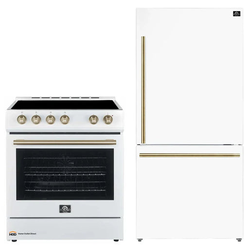FORNO 2-Piece Appliance Package – 30" Electric Range & 31" Bottom Freezer Refrigerator (White with Antique Brass Handle) Timeless European Eleg...