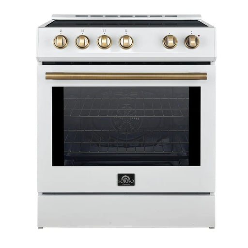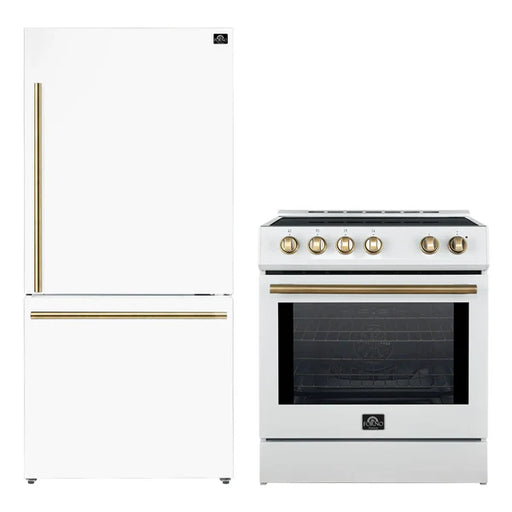FornoFORNO 2-Piece Appliance Package – 30-Inch Slide-In Induction Range & 31-Inch Bottom Freezer Refrigerator in White with Antique Brass Handles Up...