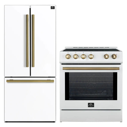 FornoForno 2-Piece Appliance Package – 30-Inch Slide-In Induction Range & 30-Inch French Door Refrigerator in White with Antique Brass Handle Upgrad...
