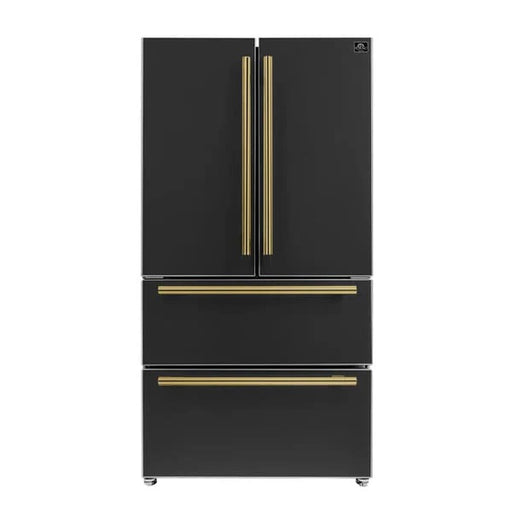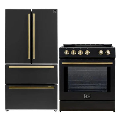 FornoForno 2-Piece Appliance Package – 30-Inch Slide-In Induction Range & 36-Inch French Door Refrigerator in Black with Antique Brass Handle Upgrad...