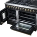Beneath the cooktop, the double electric ovens offer a combined 6.58 cu. ft. capacity and 9,700 Watts of total output. The right-side oven features a 4.32 cu. ft. true European convection system with a 1,500W fan element that ensures even baking and roasting, while the left-side 2.26 cu. ft. oven adds flexibility for multitasking family meals. Both ovens are housed in sleek black enamel interiors with tempered three-layer glass doors that retain heat and allow a clear view of your creations.