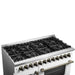 The cooktop features eight sealed burners with a total output of 107,000 BTU, including a 20,000 BTU dual-ring burner capable of simmering at an ultra-low 1,000 BTU for delicate sauces and fine dishes. Heavy-duty continuous cast iron grates provide excellent heat distribution and effortless cookware mobility, while the deep recessed black enamel cooktop cavity keeps spills contained and simplifies cleaning.